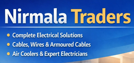 Nirmala Traders is a trusted electrical shop and supplier, offering complete electrical solutions for residential and commercial needs. The firm deals in electrical cables and wires from leading brands like Havells and Polycab, armoured cables, air coolers from brands such as Bajaj and Crompton, and provides reliable support through experienced electricians. Known for quality products and dependable service, Nirmala Traders caters to a wide range of electrical requirements.
